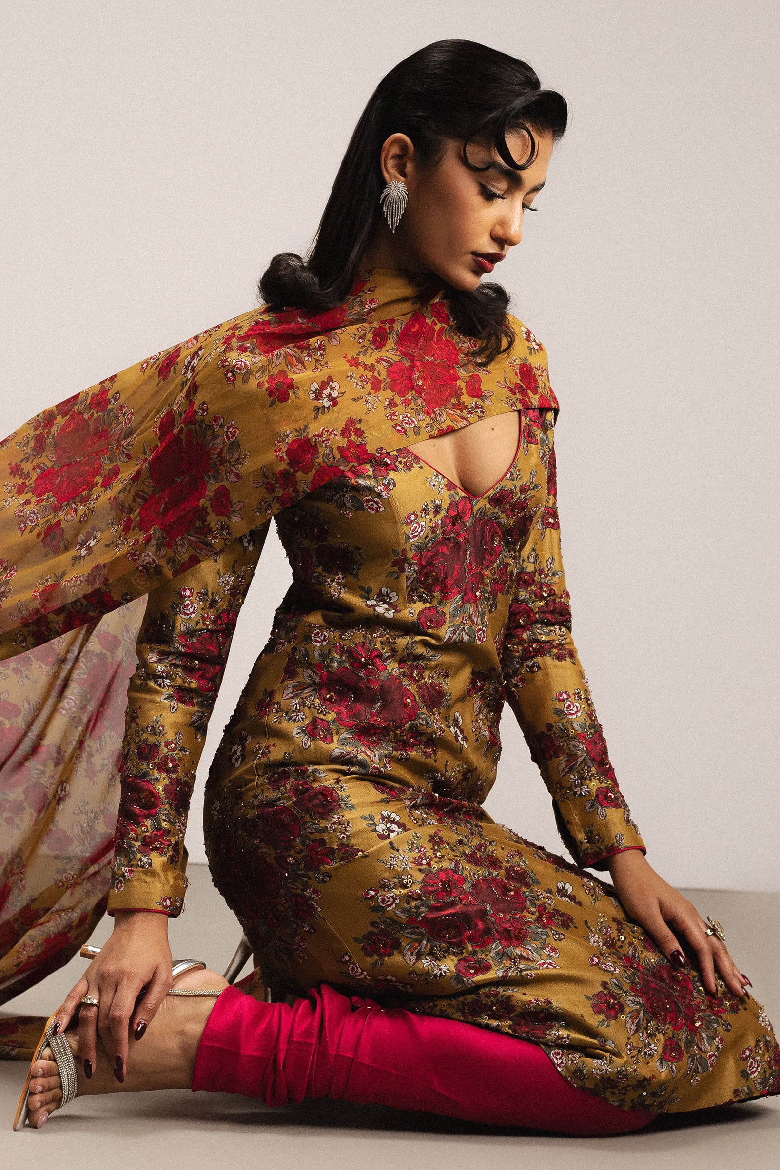 A pure raw silk printed olive mid-length shirt featuring deep front and back V necklines and fitted sleeves, adorned with delicate hand embellishment for an elegant finish. It is paired with a contrasting pink churidar pajama and a pure georgette chiffon floral printed dupatta, creating a timeless festive look.