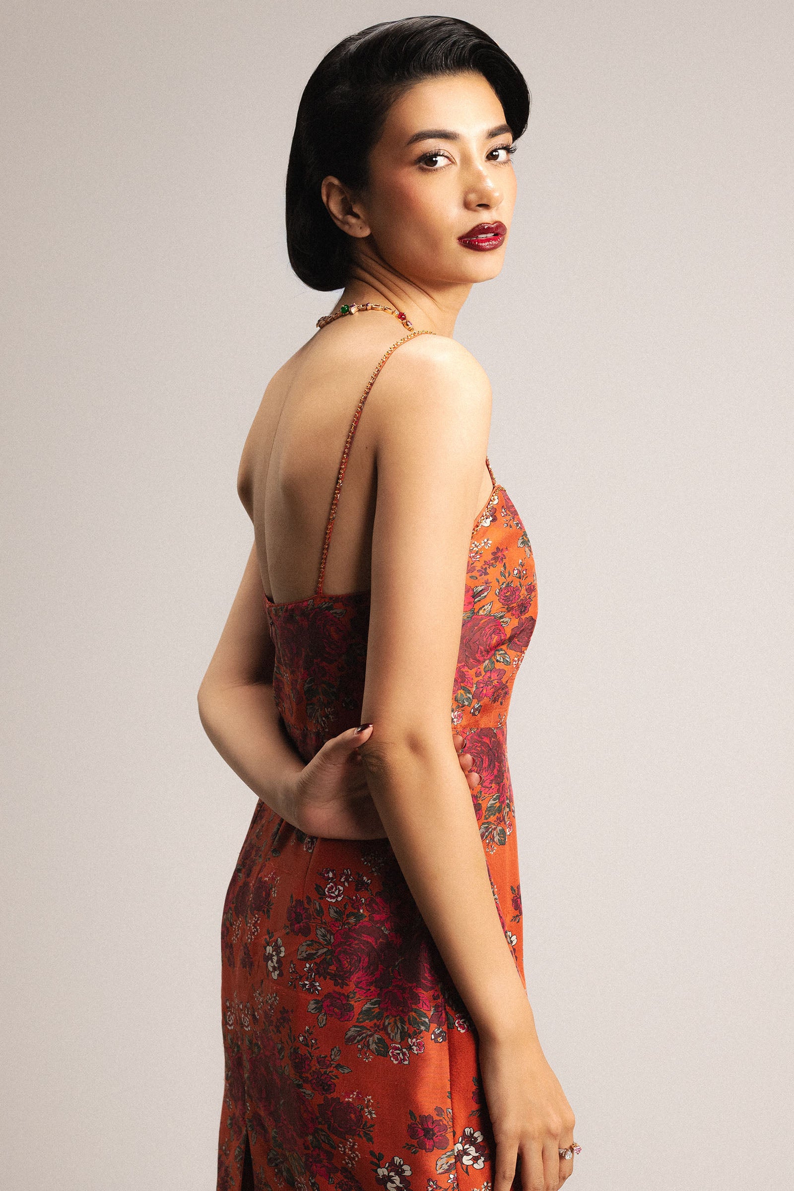 An orange floral printed paneled fitted shirt with straps and a sweetheart neckline, featuring delicate hand embellishment for a refined touch. It is paired with a matching floral farshi shalwar and a pure georgette dupatta, finished with embellishment on all four sides.